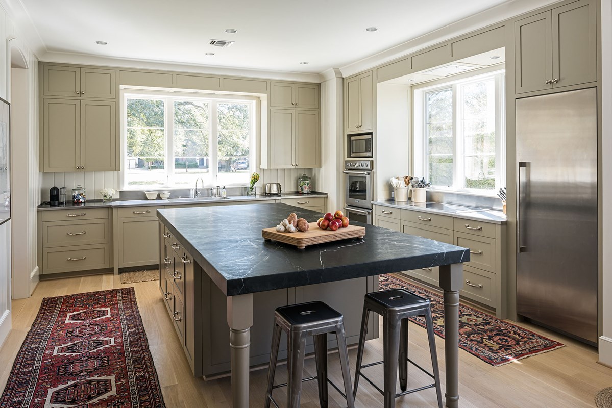 Creating gracious connections to the outdoors was a key part of our design for this new home. We looked for ways to achieve this while respecting the character of the architecture. Screened porches and covered balconies on both levels of the house, in front and back, let the homeowners enjoy fresh air from shaded comfort; these overhangs also help cool the house. Open wide, strategically placed French doors naturally ventilate the home and bring light to the interior. Traditional details — arched doorways, moldings, an elegantly curved stair — and authentic materials like white oak and brick ground the house in history.